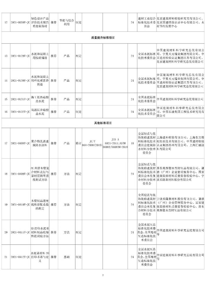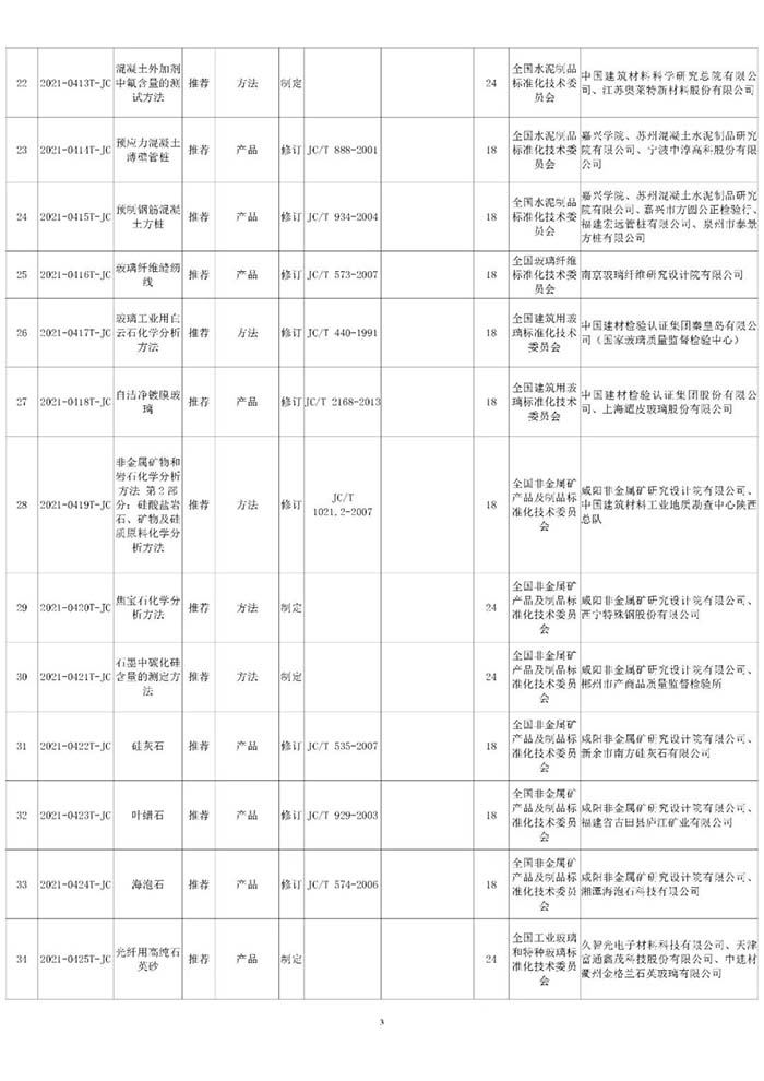 工業(yè)和信息化部辦公廳近日印發(fā)了2021年第一批行業(yè)標(biāo)準(zhǔn)制修訂和外文版項(xiàng)目計(jì)劃(工信廳科函〔2021〕25號(hào)),本批行業(yè)標(biāo)準(zhǔn)制修訂項(xiàng)目計(jì)劃共521項(xiàng),其中,由中國建筑材料聯(lián)合會(huì)提出的共有45項(xiàng)(見附表)。