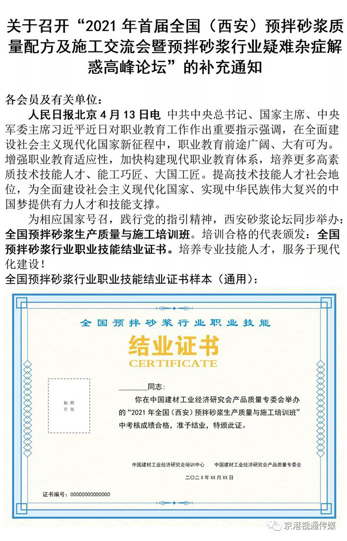 關(guān)于舉辦“2021年首屆全國(西安)預(yù)拌砂漿質(zhì)量配方及施工交流會暨預(yù)拌砂漿行業(yè)疑難雜癥解惑高峰論壇”的通知
