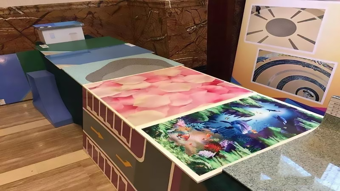 地坪與3D藝術(shù)完美融合,在常規(guī)地坪涂裝施工過程中,鋪設(shè)一層畫布,然后再加上水晶漆透明罩面,表面閃耀著水晶般明亮艷麗的光澤,閃光效果柔和,絢彩迷人。